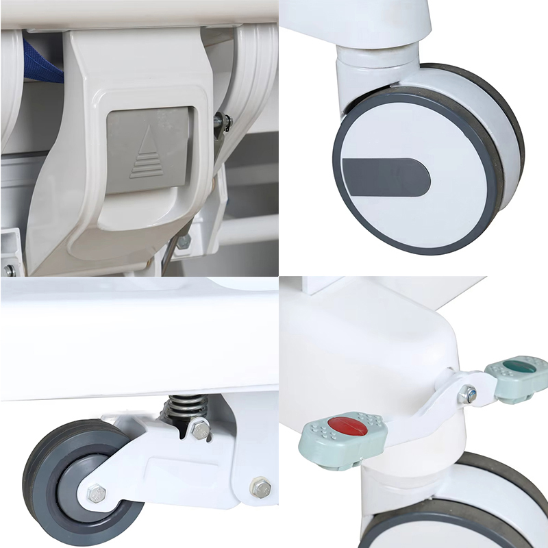 5. Siirtoajoneuvon pyörät ovat 4 6 tuuman kaksirivistä keskiohjauspyörää, jotka ovat hiljaisia, vakaita ja luotettavia. Samalla ne on varustettu ohjauspyörälaitteella, joka helpottaa käyttäjää ohjaamaan ajoneuvon korin suuntaa. Yksi henkilö voi käyttää sitä helposti, mikä on kätevämpää ja ihanteellinen;